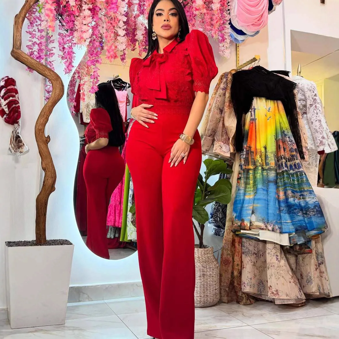 AJ4934 Cross-Border Source European American Women's Slim Autumn Fashion Elegant Personality Chiffon Lace Patchwork Lace-Up